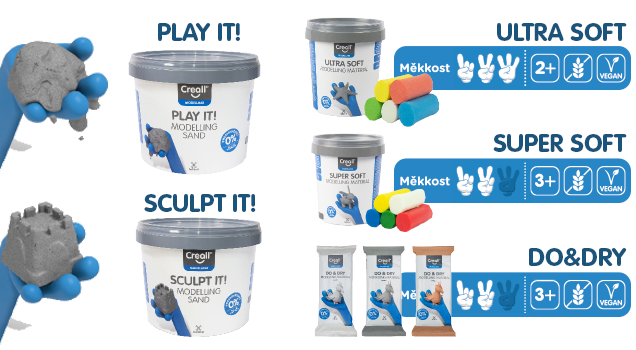 Modelovací hmota je jemná, snadno se zpracovává a na vzduchu tvrdne během 24 hodin. Hotové výrobky lze dekorovat barvami Molenaer. Modelovací písky Creall Play It a Sculp It jsou hebké na dotek, nikdy nevysychají a rozvíjí jemnou dětskou motoriku. Zatímco Play It je ideální pro volnou hru a rozvoj smyslů a motoriky, Sculp It vyniká skvělou tvarovatelností. Rozdíl mezi písky najdete zde Všechny výrobky mají veganské složení a neobsahují lepek. |