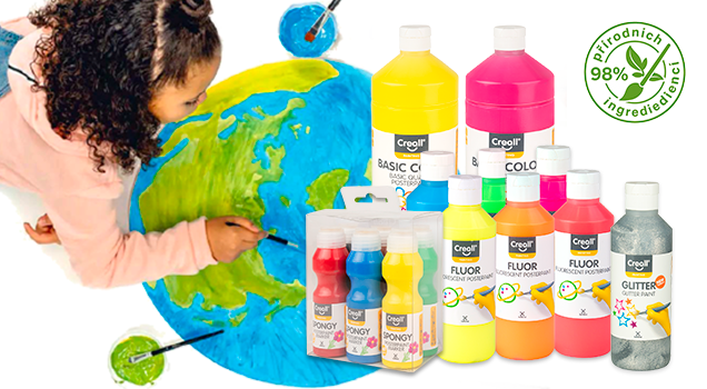 Kvalitní syté temperové barvy s vynikajícími vlastnostmi, obsahují 98% složek přírodního původu a splňují normu EN–71. Proto jsou vhodné i pro nejmenší uživatele, snadno se smývají z rukou a většiny textilií. Kolekce speciálních barev umožňuje proměnit každý projekt neobyčejné umělecké dílo. Složení barev nabízí aplikaci na různé typy povrchů – od papíru a kartonu, až po dřevo, sklo, plast nebo textil.