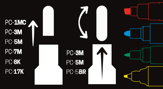 Většina hrotů POSCA popisovačů je omyvatelná a snadno vyměnitelná (PC-1MC, PC-3M, PC-5M, PC-7M, PC-8K a PC-17K). Některé jsou také reverzibilní (PC-3M, PC-5M, PC-5BR), s možností otočení hrotu. Pokud špička někdy vyschne v průběhu času (například pokud nebylo víčko správně nasazeno), můžete ji namočit do sklenice vody, a následně ji můžete znovu použít. |