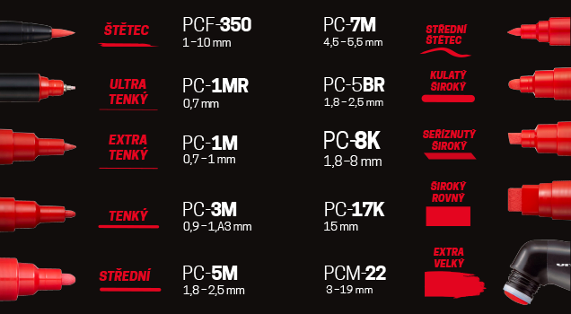 POSCA nabízí deset velikostí a sedm doplňujících tvarů hrotů. Jejich vysoká kvalita zaručuje odolnost a spolehlivost. Linka je plynulá. Práce s popisovačem Posca je skutečně jedinečný kreativní zážitek. Inspirace (pdf): UNI POSCA kreativní popisovače - Inspirace |